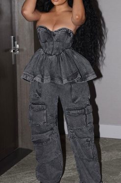Solid Color Patchwork Girly Ruffle Denim Blouse